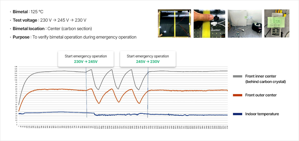 During normal operation at 230V, the bimetal does not activate. However, during an emergency condition at 245V, the bimetal activates and cuts off the power supply.